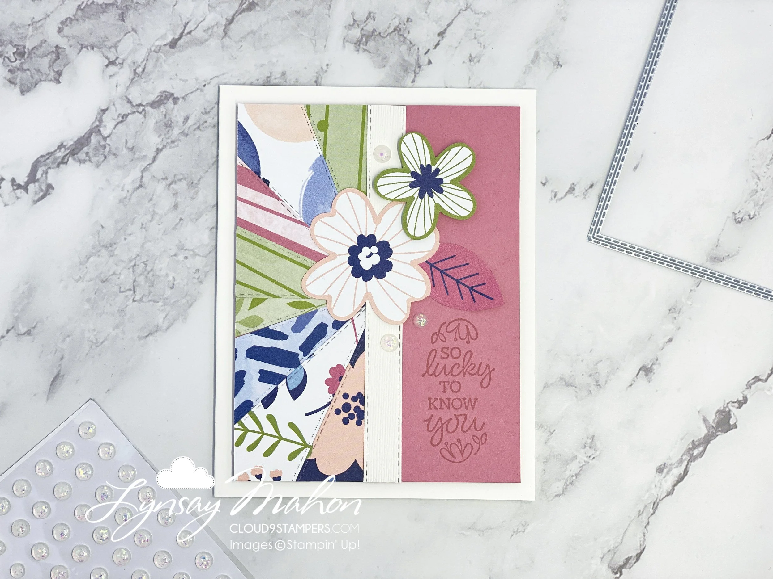 I created a band in Shimmery White Cardstock to lay over the centre so imperfections can't be detected. I finished the card by fussy cutting some flowers from the soon to be released designer series paper, Paper Blooms.