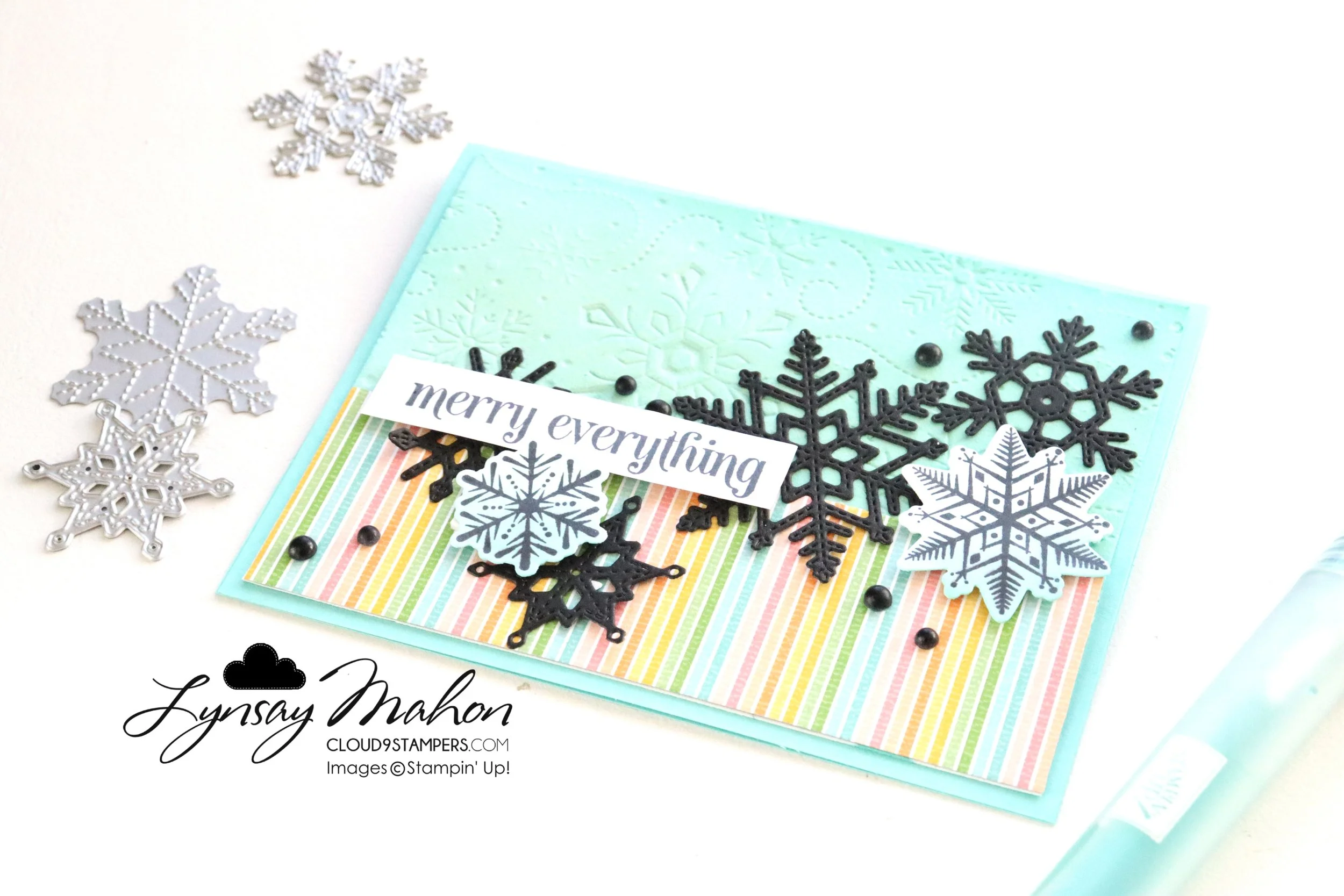 The second way I used the spritzers was to colour the Basic White Cardstock of the snowflake die-cuts. This gave an ombre effect that helps build more colour coordination into the project.