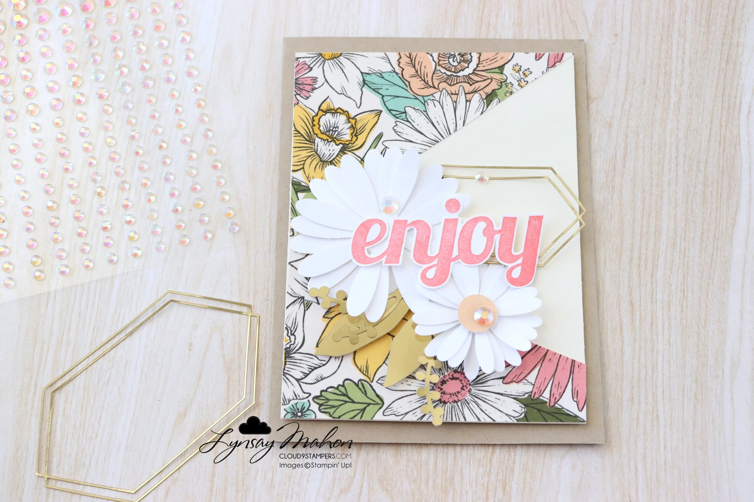 I LOVE the Daffodil Afternoon 12X12 Designers Series Paper (DSP). This Saleabration Reward is free with a $60 until Feb. 28, 2022. I wanted to let the paper do some of the heavy lifting on this project, so used the DSP as the split front.