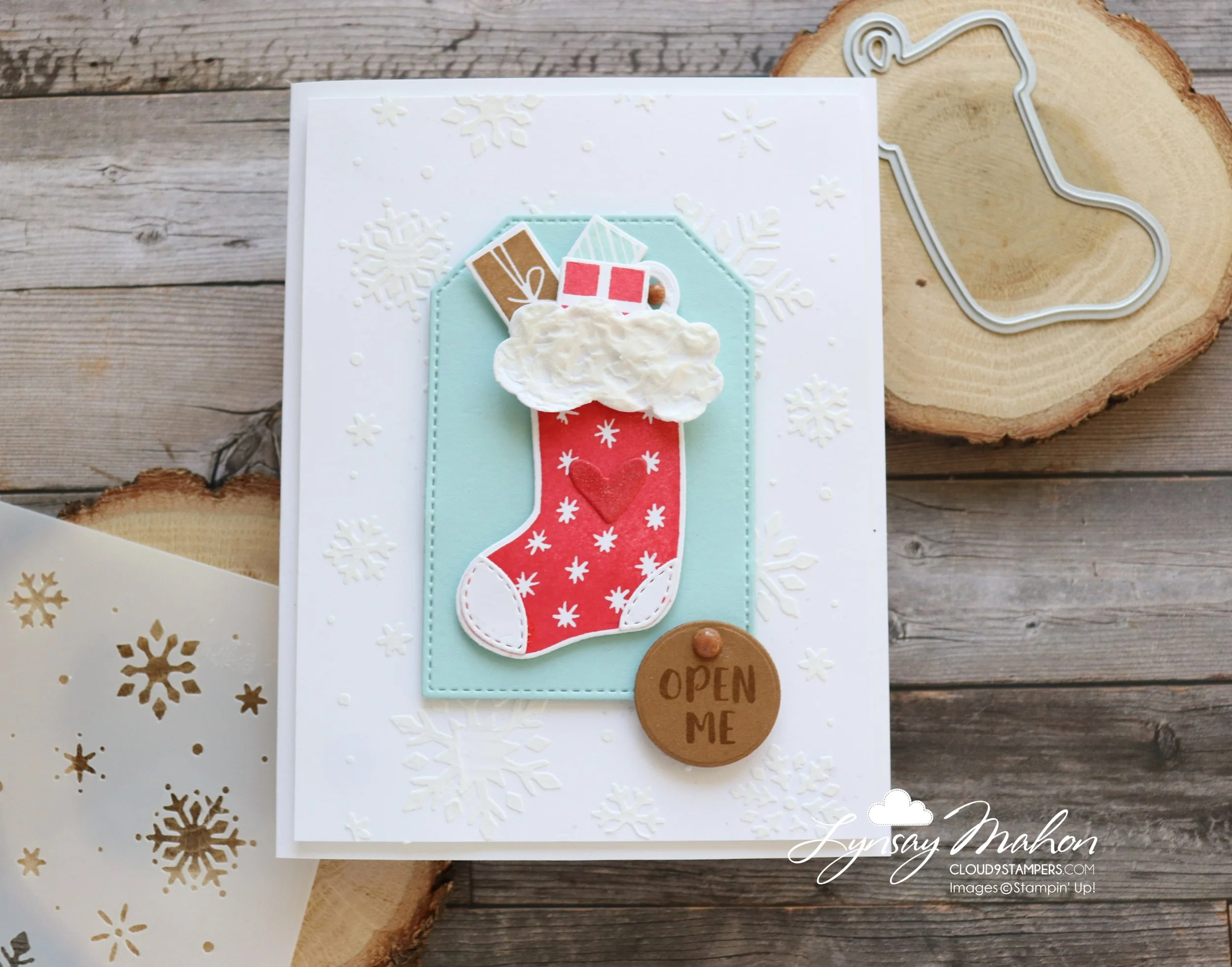 For my project, I wanted to show a card with a stocking brimming with wrapped gifts. I used the stocking from the Sending Cheer Bundle as the focal point of my card. The tag and gifts are incorporated from the Merriest Trees Bundle.