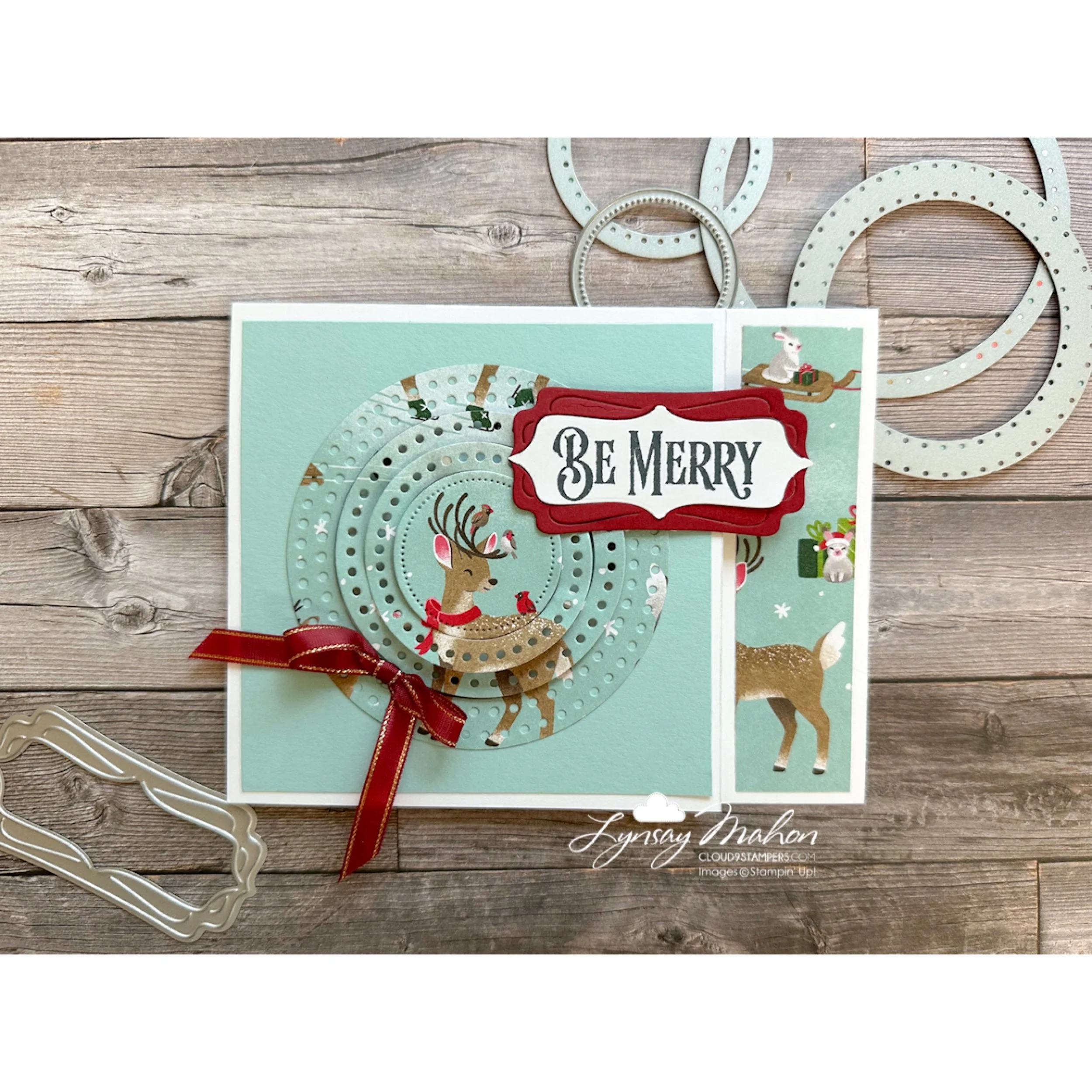 There are some incredibly cute designer series paper (DSP) coming out on Sept. 4, 2024, so I decided to use a sheet from the Reindeer Days DSP as my focal point. The Everyday Details Dies have concentric circles built in, so I used that to create the circle layers.