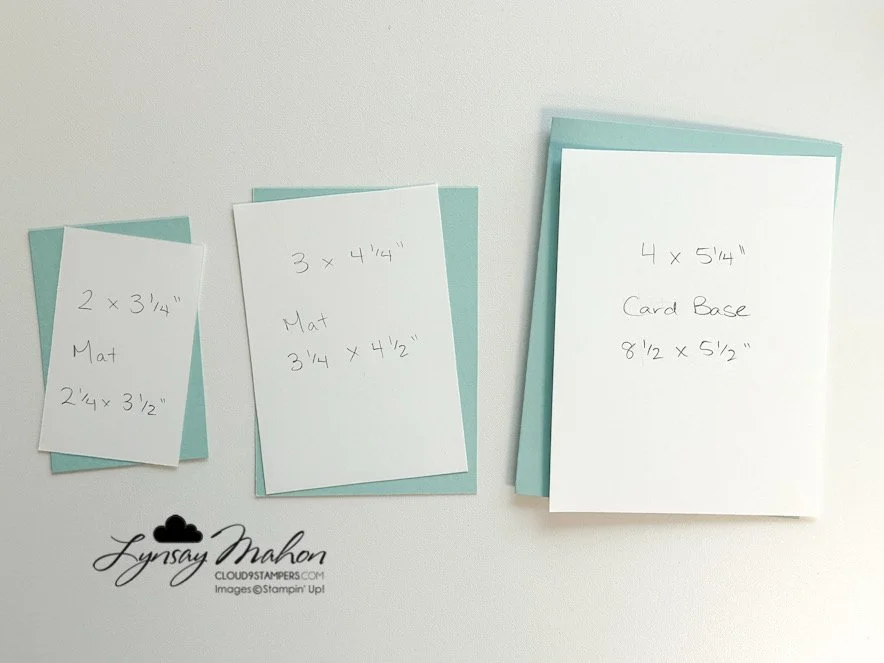 Here's where the magic happens: layer each of the Whisper White cardstock pieces onto the Pool Party mats. Adhere each layer (large to small), being mindful that the images line up.