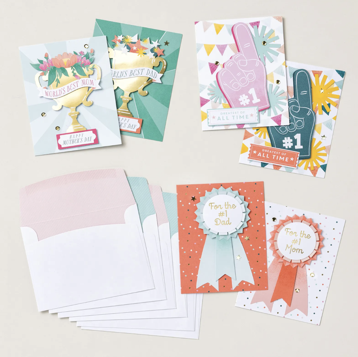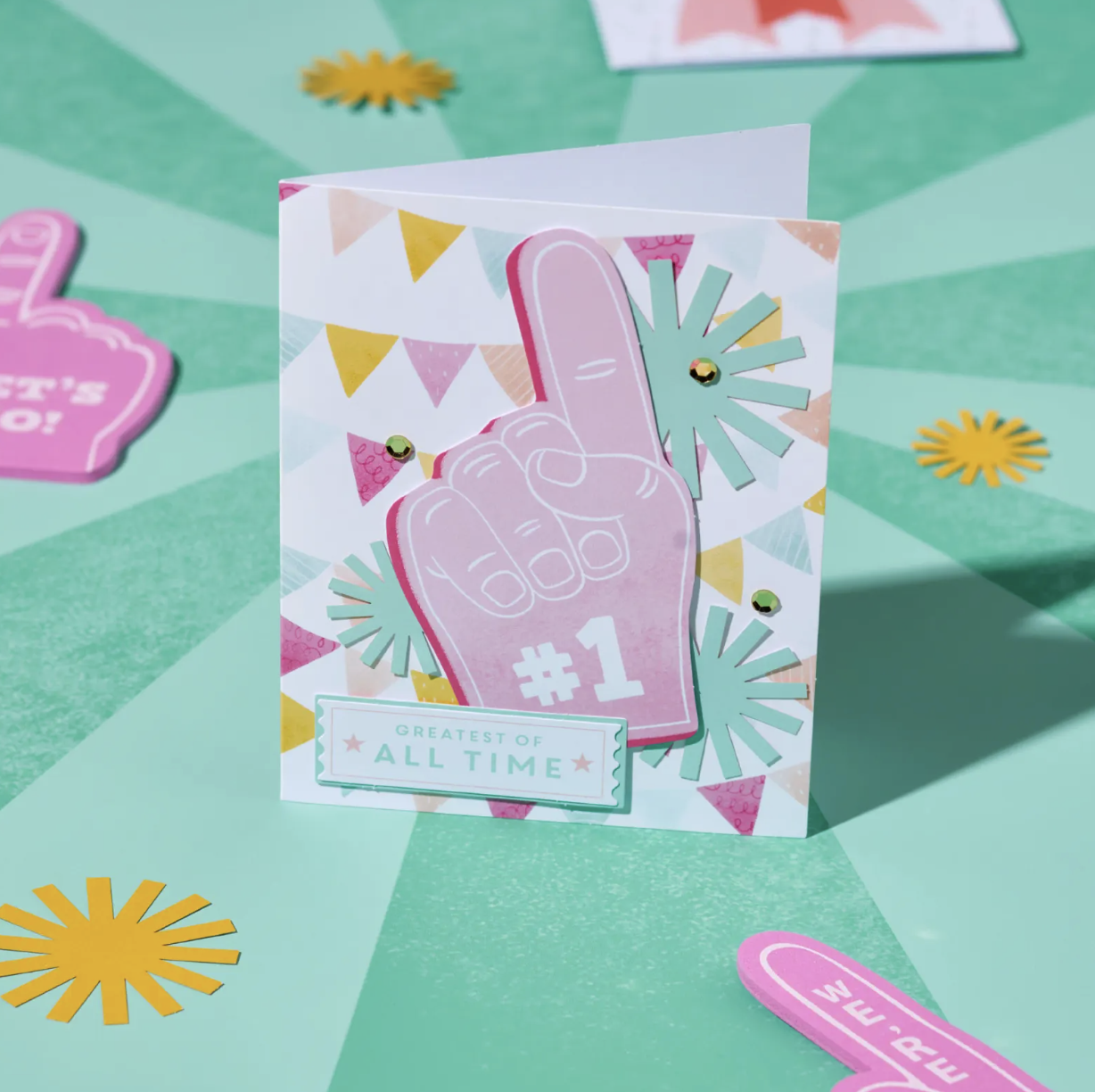 Inside the kit, you’ll find everything you need to make six different cards, each with bold designs featuring foam fingers, ribbons, and trophy images. The bright color palette adds energy and personality, making these cards perfect for birthdays, thank-yous, encouragement, or just because.